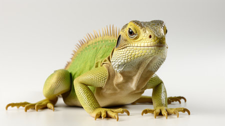 A vibrant green reptile with intricate, textured scales and bold spines, captured in sharp detail to emphasize its striking patterns and natural beauty against a simple b