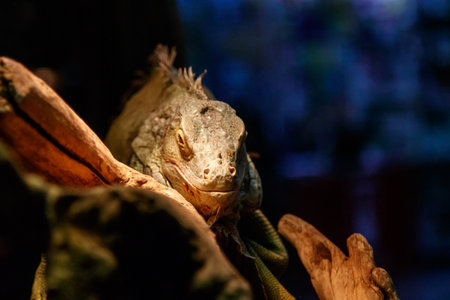 Close-up of green iguana on its habitat on land - wooden branch. Beautiful lizard in zoo or terrarium. Exotic tropical animals concept.