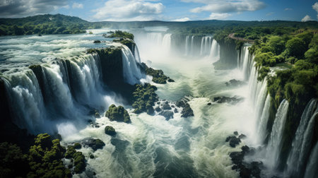 Landscape aerial view of Iguazu falls waterfall, rivers, rainforest, and jungle