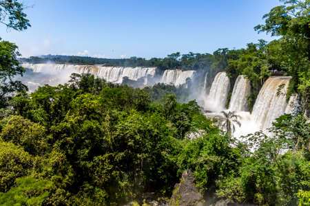 Foz do Iguacu Iguazu Falls waterfall fall waterfalls cascade cascades in tropical nature rainforest panorama view with blue sky and turquoise green water in Parana Brazil and Misiones Argentina.