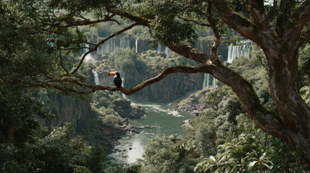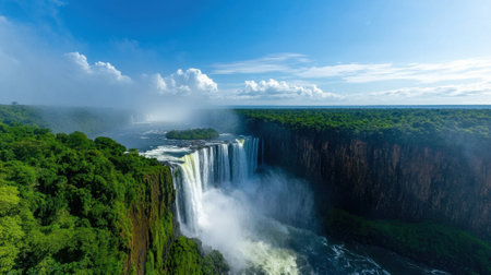 Aerial view of Iguaçu Falls in Brazil and Argentina, with the connecting bridge across the river visible, symbolizing unity between the two countries. A wide shot showing water cascading down from multiple falls into the expansive jungle below. The sky is clear blue with white clouds adding to the natural beauty of the scene. In the style of documentary photography. --chaos 30 --ar 16:9 --quality 2 --stylize 500 --v 6.1 Job ID: cf6743f7-332e-4bee-92a2-39bf6382dc9a