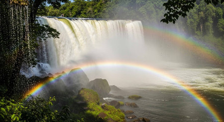 Water plunges down Iguazu Falls, creating a spectacular show of mist and rainbows. Lush greenery surrounds the falls, highlighting the natural beauty of this UNESCO World Heritage site.