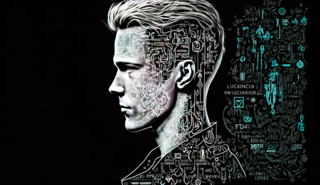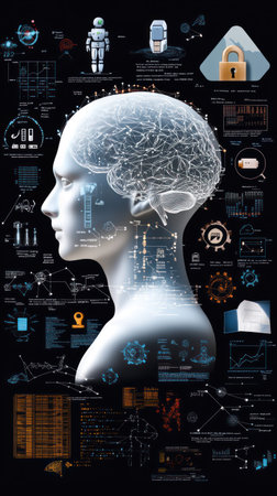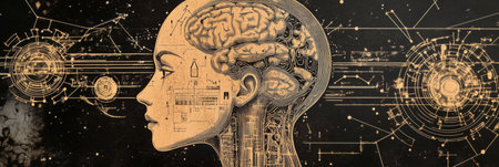 Outline of a human head features intricate schematic designs related to artificial intelligence, symbolizing modern technology and innovation.