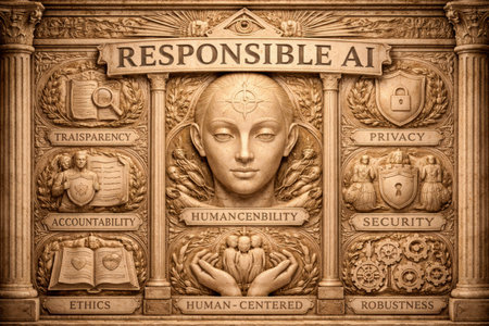 Sculpture exhibits principles of responsible AI, showcasing themes like transparency, privacy, and security in a detailed format during an event.