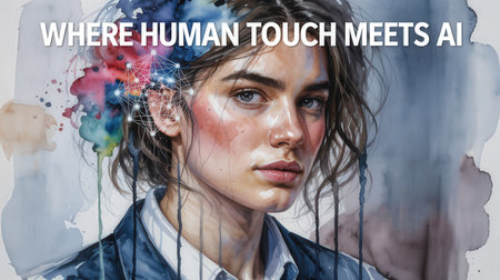Watercolor-style portrait of a woman blending realism and abstraction, featuring vibrant AI-inspired digital elements around her head. Includes text WHERE HUMAN TOUCH MEETS AI.