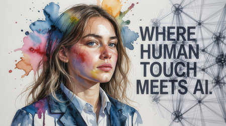 Artistic portrait of a woman with vibrant watercolor splashes surrounding her face, symbolizing creativity and innovation. Text reads WHERE HUMAN TOUCH MEETS AI. on the right.
