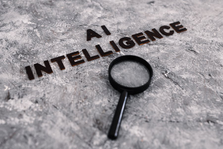 AI intelligence text with magnifying glass analysing it, concept of machine learning and generative technology