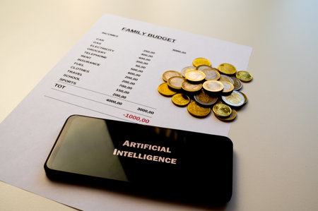 Family budget sheet, coins and artificial intelligence device. Use of artificial intelligence to manage monthly expenses.