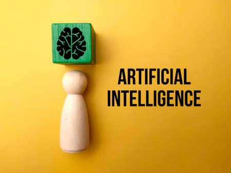 Wooden figures and colored block with brain icon and the word Artificial Intelligence.