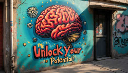 This striking mural features a vividly colored brain intertwined with mechanical gears, symbolizing the fusion of creativity and intellect. The bold phrase Unlock Your Potential invites viewers to explore their capabilities, set against a backdrop of bright blues and whimsical designs that evoke inspiration and motivation.