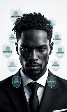 A powerful man in coal black, surrounded by translucent shields marked with brand values, symbolizing protection, consistency, and trust