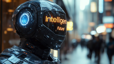 Futuristic robot with illuminated Intelligent Future message in urban setting