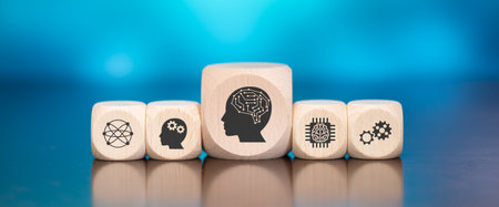 Wooden blocks with symbol of machine learning concept on blue background
