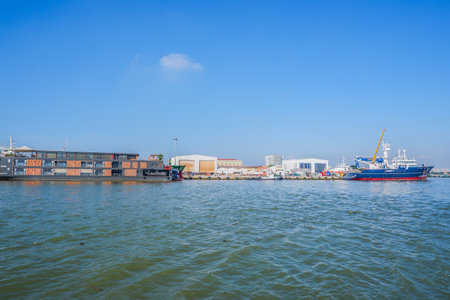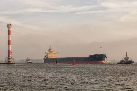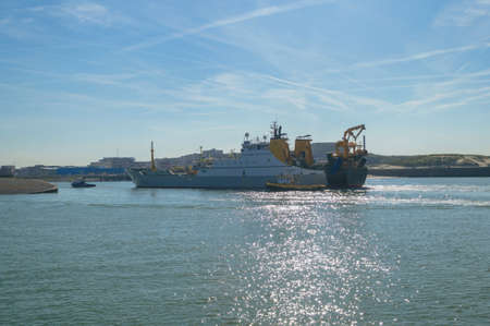 Hague, The Netherlands, October 05, 2018: Tow of the big ship into the harbor on sunny day