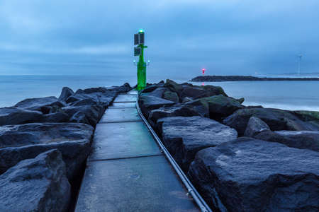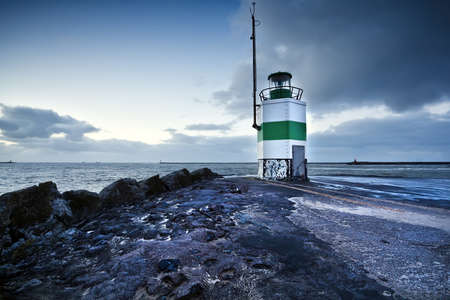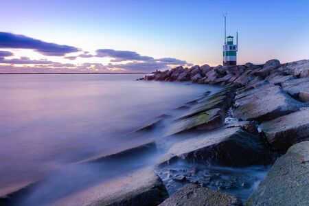 Sunset at the IJmuiden southern pier with the green and white lighthouse during blue hour with a long exposure and water ond the rocks.