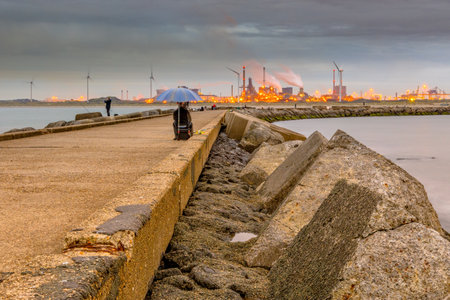 Concrete jetty near IJmuiden with angler fishermen on a cloudy afternoon and heavy industry in the background. North Holland Province, The Netherlands
