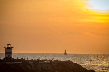 Hague, The Netherlands, October 05, 2018: People relaxing on the pier with lighthouse on sunny day