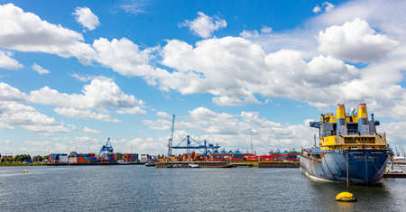 Rotterdam harbor, Netherlands. July 2nd, 2019. Ship anchored at international commercial port of Rotterdam, sunny summer day