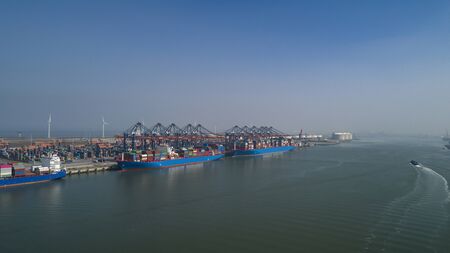 Aerial view of container terminal in the harbor MAASVLAKTE, Netherlands. A large containership from Cosco is unloading