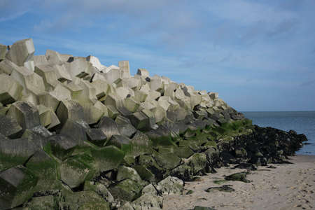 Dutch dike by the North Sea made of concrete stones, Netherlands