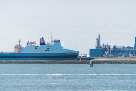 Massive ship docking at Maasvlakte Rotterdam. Cloudy weather, calm sea. Unconventional things to see in the Netherlands. High quality photo