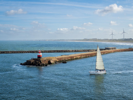 Sailing yacht setting out to sea on a sunny day passing the breakwater and lighthouse with wind turbine in the distance