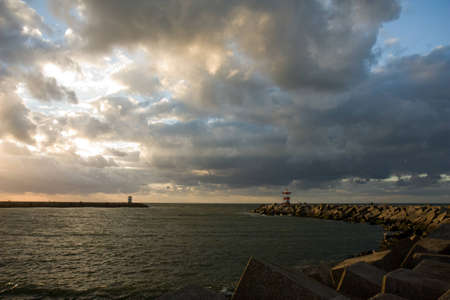 North harbour entrance lighthouse in IJmuiden under storm skies