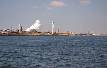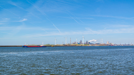 Steel factory plant with chimneys in the Netherlands, ship in front