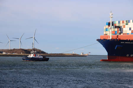 Tugship brings APL Merlion container ship inside the port of Rotterdam at the Maasvlakte Harbor
