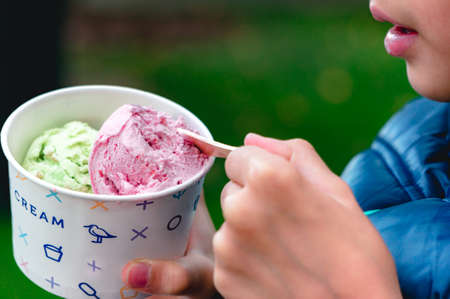 Close view of child eating ice cream