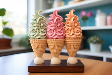 Colorful ice cream in waffle cones on shelf in coffee shop