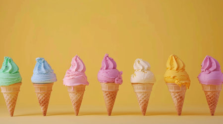 A vibrant row of colorful ice cream cones against a bright yellow background, perfect for summer themes.