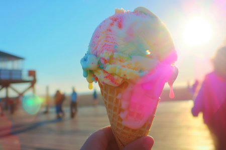 Scoop ice cream with a waffle cone in hand on the beach, sunset moment.