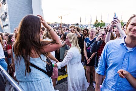 Traena, Norway - July 7 2017: audience cheering and dancing during concert of Norwegian pop singer Sigrid at Traenafestival, music festival taking place on the small island of Traena