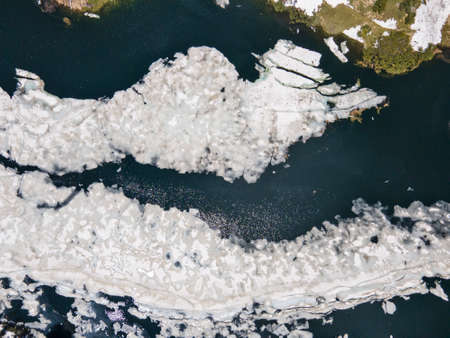 Ice floes on the water surface of the lake. Aerial top down view. Baikal lake, Siberia, Russia. Abstract nature background