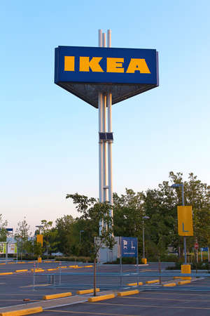 Zagreb, Croatia - 17th, August, 2019 : Big board sign Ikea in front of Ikea shopping center in Zagre, Croatia.