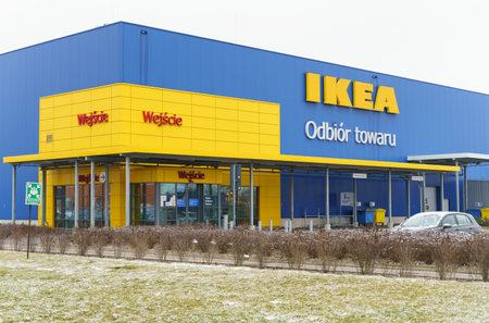 Poznan, Poland - January 25, 2023: Blue and yellow Ikea store building in winter.