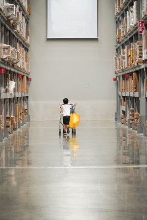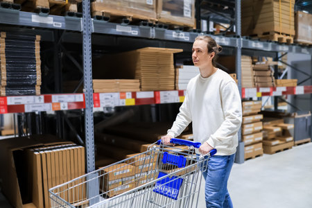 Young man pushing shopping cart in furniture warehouse aisle, walking between shelves with boxes. High quality photo