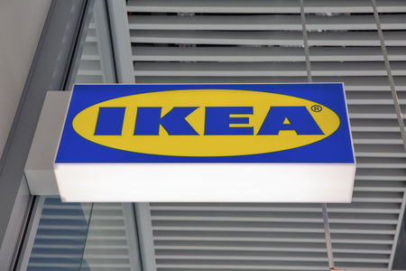 Vilnius, Lithuania - June 09, 2022: IKEA logo sign on Ikea shop wall. Ikea is multinational conglomerate that designs and sells ready to assemble furniture, kitchen appliances and home accessories