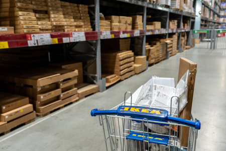 Belgrade, Serbia - January 02, 2023: Shopping cart with Ikea logo in store warehouse