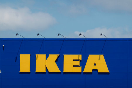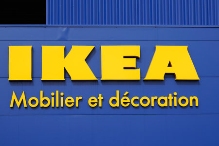 Lyon, France - July 27, 2015: IKEA sign on a wall. IKEA is a multinational group of companies that designs, sells ready-to-assemble furniture. IKEA owns and operates 353 stores in 46 countries