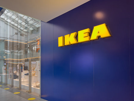 BANGKOK, THAILAND - February 25, 2024. Logo of IKEA furniture store in Bangkok. World's largest retailer of ready-to-assemble or flat-pack furniture