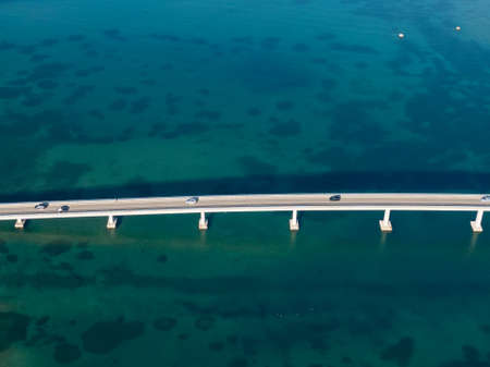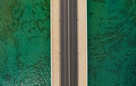 Top down view of beautiful elevated road and tollway surrounded turquoise water. Shot at the sea