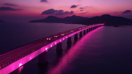 Capture the beauty of a stunning sunset illuminating a bridge, surrounded by mountains. The serene water reflects vibrant colors, creating a tranquil atmosphere.