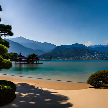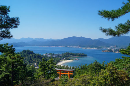 A photo of the torii gate at its center, orange in color, located on island, with pine trees and mountains in background, with sea to one side, clear blue sky, in Miyajima Japan. --ar 3:2 --v 6.1 Job ID: ad975518-1e8d-4132-ac6c-2e86f2d65900