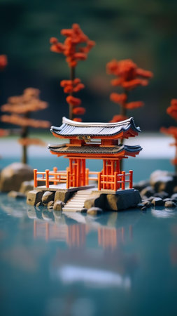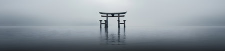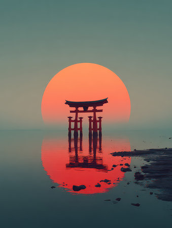 A stunning torii gate stands at sunset, surrounded by still water, creating a picturesque reflection. This serene scene evokes tranquility and beauty.