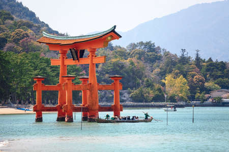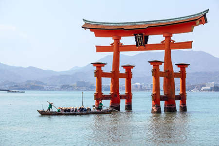 MIYAJIMA, JAPAN - CIRCA APR, 2013: Tourist boat passes under red sacred torii gate at sea high tide. The Miyajima Island (Itsukushima), Japan