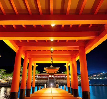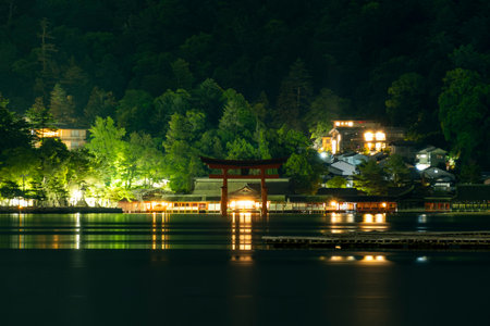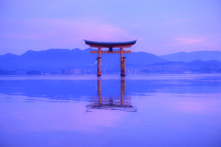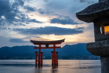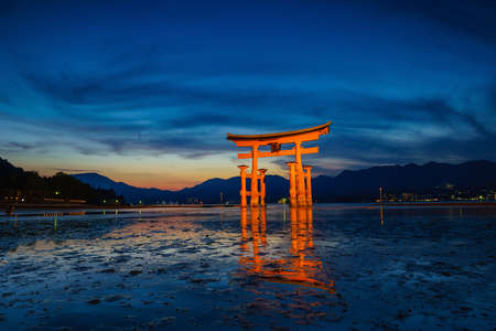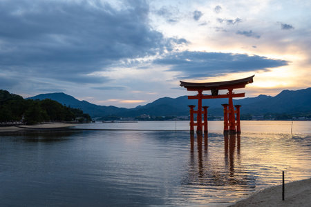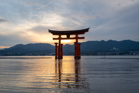 A breathtaking sunset over the famous historic floating torii of Miyajima, Japan