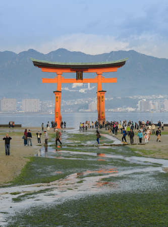 Great orange Torii gate of Itsukushima, Miyajima island, Japan