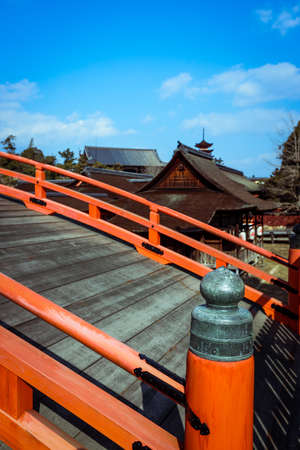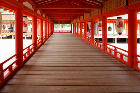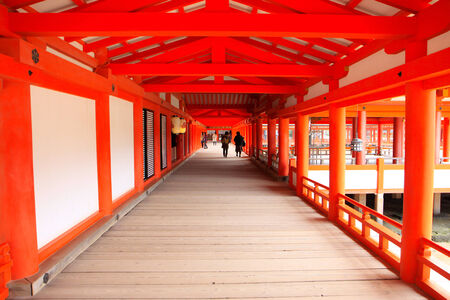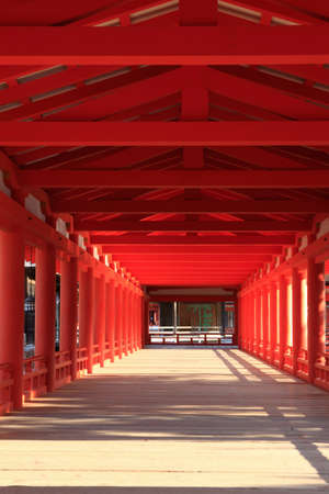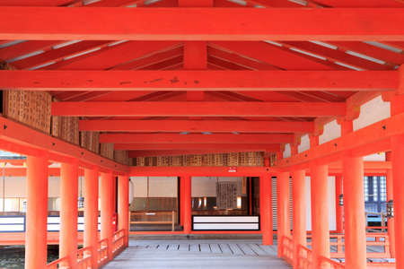 Wooden path in red shrine of Miyajima, Japan